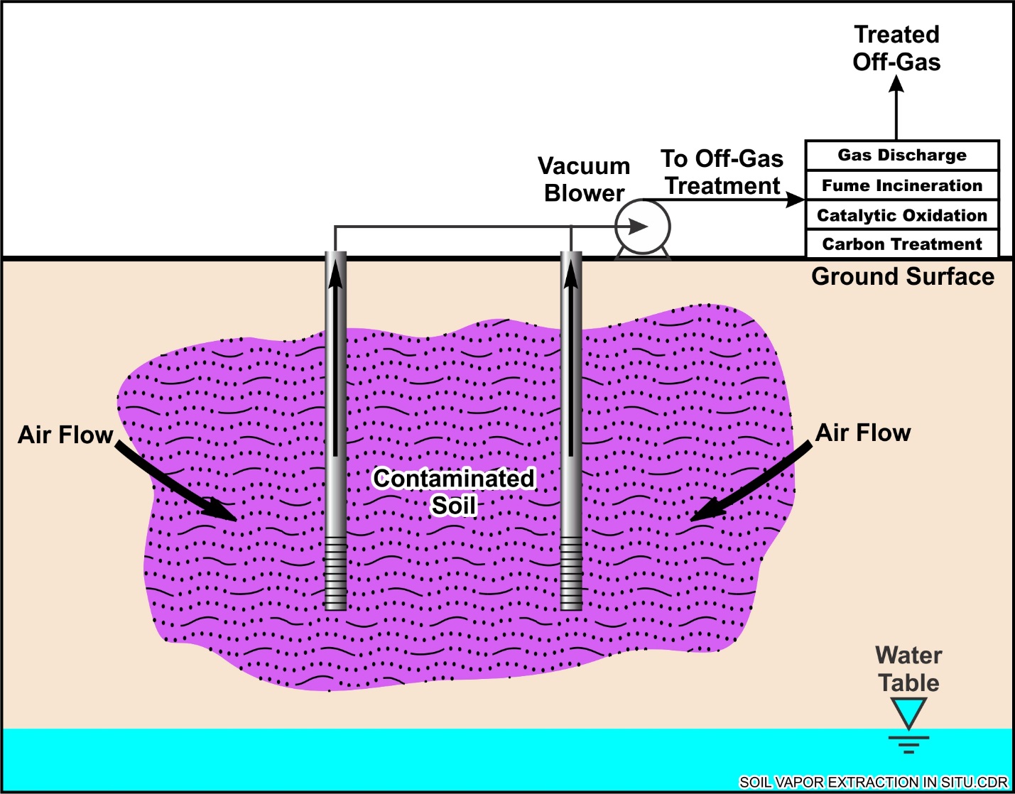 SVE establishes a vacuum in the subsurface to create a pressure/concentration gradient that allows for the mass transfer of applicable contaminants from the NAPL or adsorbed phases and transfer of constituents dissolved in soil moisture to the vapor phase. The vapor is then recovered from the subsurface through extraction wells and is then treated aboveground to recover or destroy the contaminants. The components of an SVE system can include extraction wells, conveyance piping, manifold, air filter, vacuum blower, silencer, air/water separator, valves, instrumentation/controls, an off-gas treatment system, influent and effluent vapor sampling ports, and vacuum/vapor monitoring probes or wells.